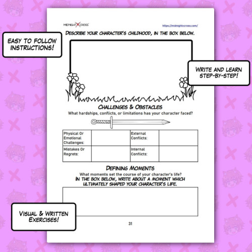 This pro version is crafted for storytellers who blend writing and illustration. With expanded drawing spaces, detailed checkboxes, and advanced prompts, it helps you explore your character visually, emotionally, and narratively. It is designed to support creators who want to understand all aspects of their character; from appearance, voice, and skills to beliefs, memories, and transformation.