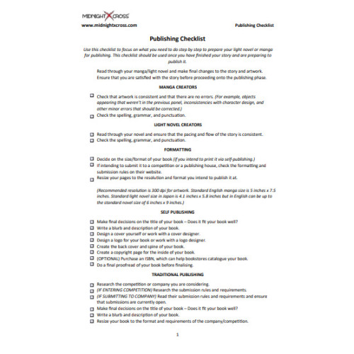 This publishing checklist can help you to prepare everything you need for publishing your manga, comic, or light novel. There are questions suitable for whichever publishing method you are choosing to focus on: traditional publishing, self-publishing and online publishing.