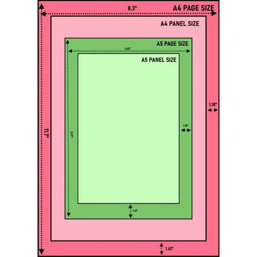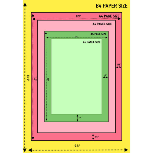 Most professional mangaka use B4 Deleter Comic Paper, which is 9.8" x 13.9" in size. While this paper size is commonly used in comic creation in Japan, it may be difficult or expensive to purchase internationally. This size chart uses A4 and A5 paper sizes to provide you with a printable template which you can use to create panel sizes traditionally on A4 or A5 paper. You can also use the measurements in the chart to draw the panels onto your desired paper size!